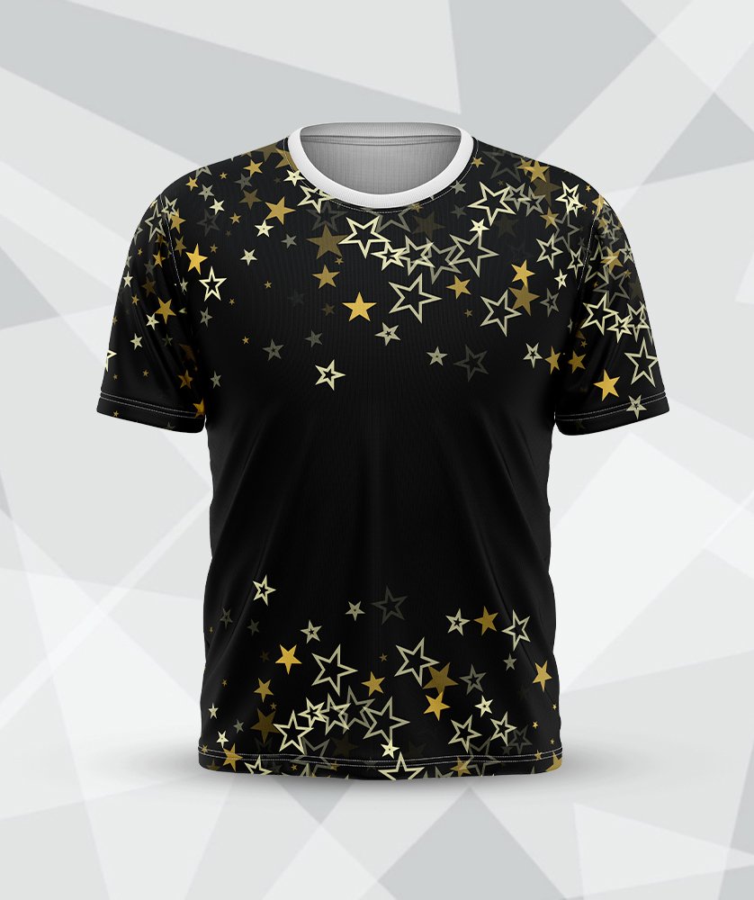 Celebrate success with this elegant black tee featuring cascading gold stars. This festive look, designed by 4naprinting, is ideal for awards nights or team celebrations. You need premium custom t-shirt printing for such special events. We are your expert custom t-shirt design maker in Kuala Lumpur. Trust our t-shirt printing to make you shine. Order your celebratory batch!