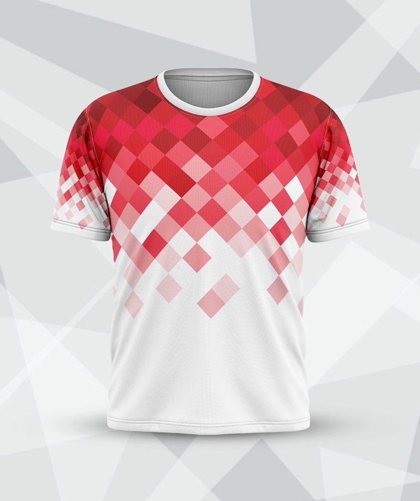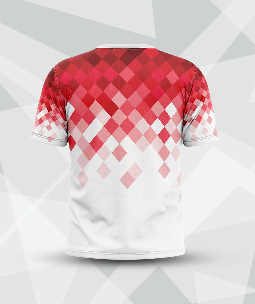Stand out with this dynamic red pixel gradient design. Ideal for racing teams or active brands seeking a modern round-neck style. 4naprinting delivers superior custom t-shirt printing services in Kuala Lumpur. Elevate your brand visibility today. Start your bulk order!